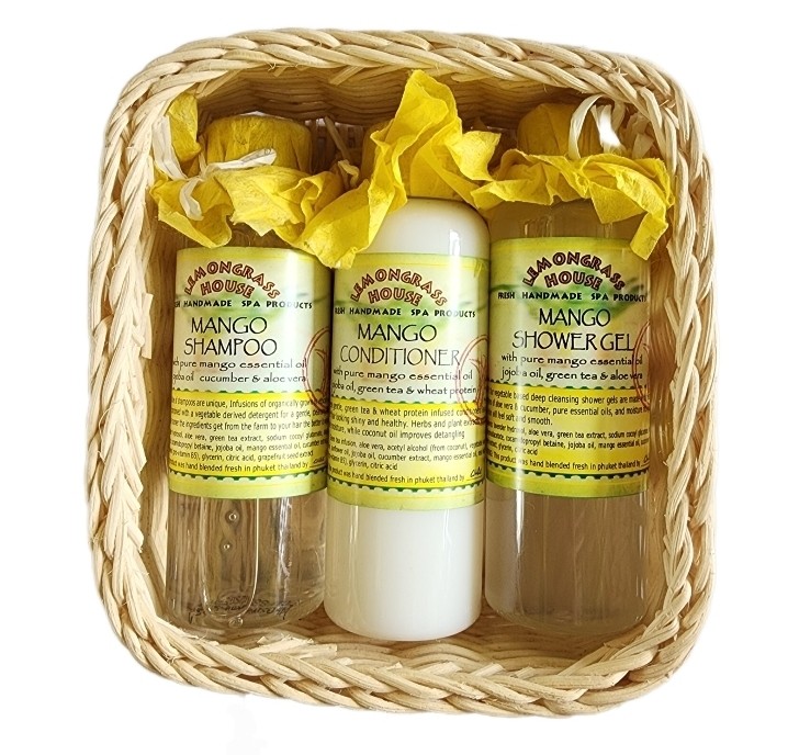 Подарочный набор Lemongrass House с ароматом манго — шампунь, кондиционер и гель для душа (Манговое блаженство) в подарочной корзинке