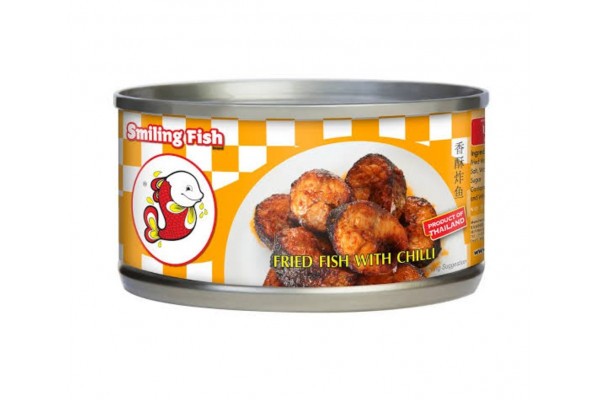 Вкусная жареная рыба с чили перцем в вакуумной консервной банке.