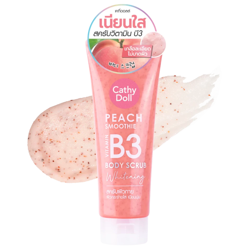 Cathy Doll Peach Smoothie Vitamin B3 Body Scrub Whitening — это мягкий скраб для тела, который эффективно удаляет ороговевшие клетки кожи, выравнивает тон и придаёт коже гладкость и сияние. Формула с витамином B3 (ниацинамидом) и экстрактом персика помогает уменьшить тусклость кожи, улучшить её текстуру и поддерживать здоровый внешний вид.